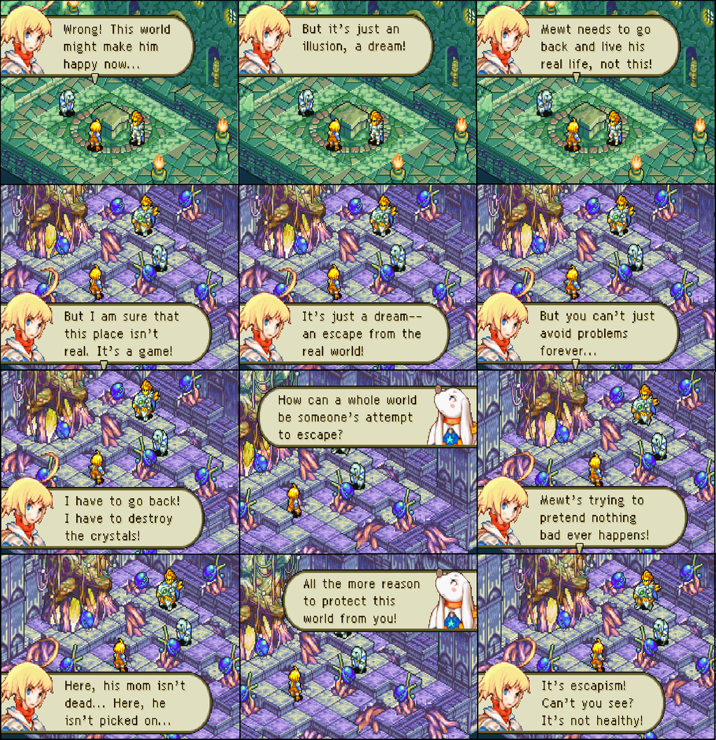 FF外伝のゲームボーイアドバンス作品。ジャンルはシミュレーションRPG。ストーリーをざっくり解説するとFF版ネバーエンディングストーリー。魔法の本の中の世界に引き込まれた少年少女が冒険を通して成長して現実に帰る物語。夢の世界から帰りたがらない友人や弟たちと対峙した主人公マーシュは鉄拳制裁で目を覚まさせようとする。ゲーム性の問題点として、戦闘ごとに決められたルールを破ったときの罰則が面倒臭いという批判もあるが、かなり面白い。北米版はリッツが仲間になる等のシナリオの追加、ロウ等のシステム修正がされたおかげで、国内40万本出荷に対し欧米ではミリオンヒットを記録した。ちょっとおま国。ゲームとしても異世界転生モノとしてもおすすめ。英語が大丈夫な人は中古の北米版をネットで買ってプレイするといいかもしれない。Wii Uでダウンロード版も販売されているっぽい。