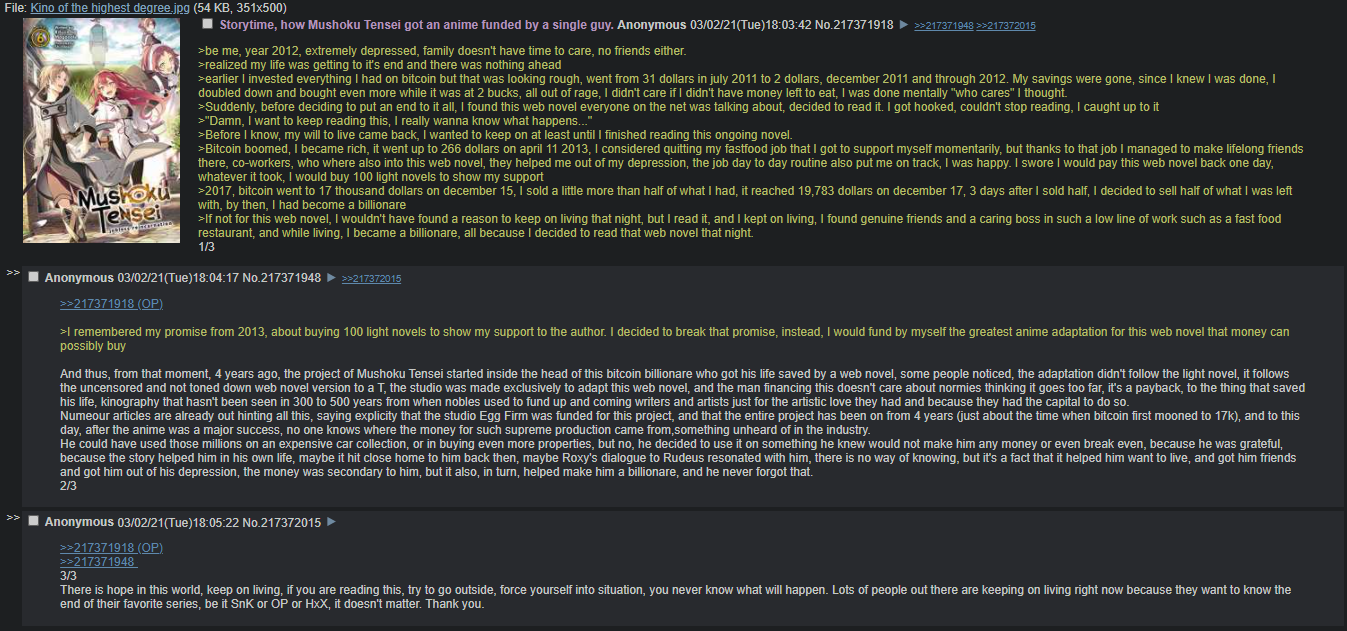 日本のビットコイン長者の原作ファンが金出したんだ。予算は多分異常なくらいあって、制作メンバーも超が付く熱意っぷり。無職転生ファンは本当に恵まれてるよ