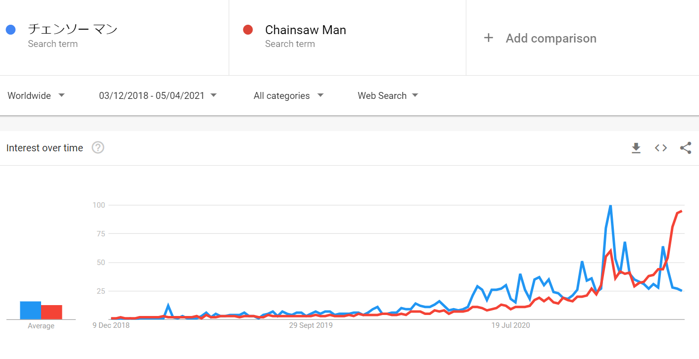 面白いことに、日本ではブームが鎮火しつつある。世界的にはChainsaw Manは日に日に人気が高まり、現在ピークを迎えている